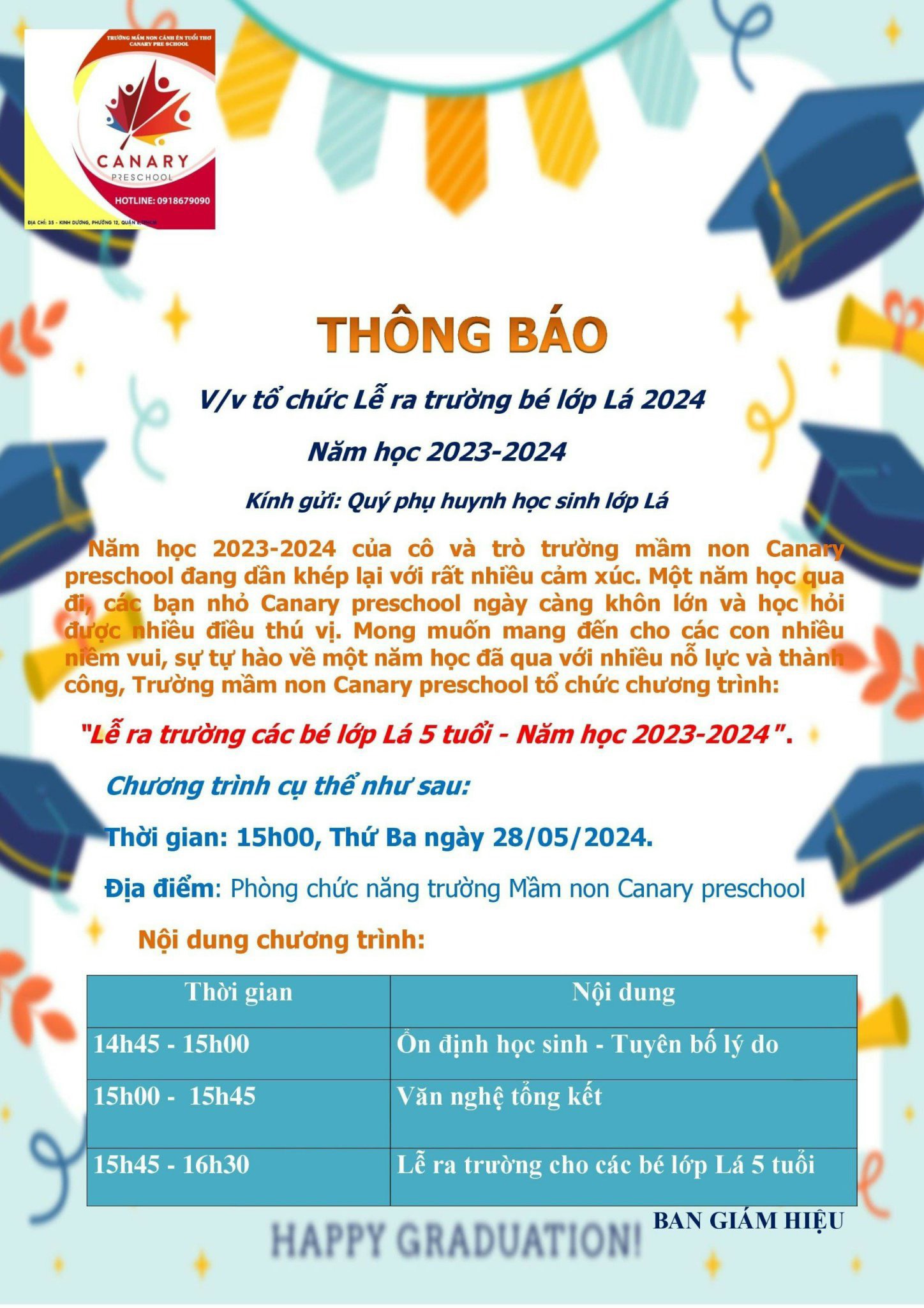 Chúng tôi hy vọng rằng buổi lễ sẽ là một dịp đầy ý nghĩa và đáng nhớ cho tất cả mọi người. Cảm ơn Quý Phụ Huynh và các em đã đồng hành và ủng hộ trong suốt năm học vừa qua.