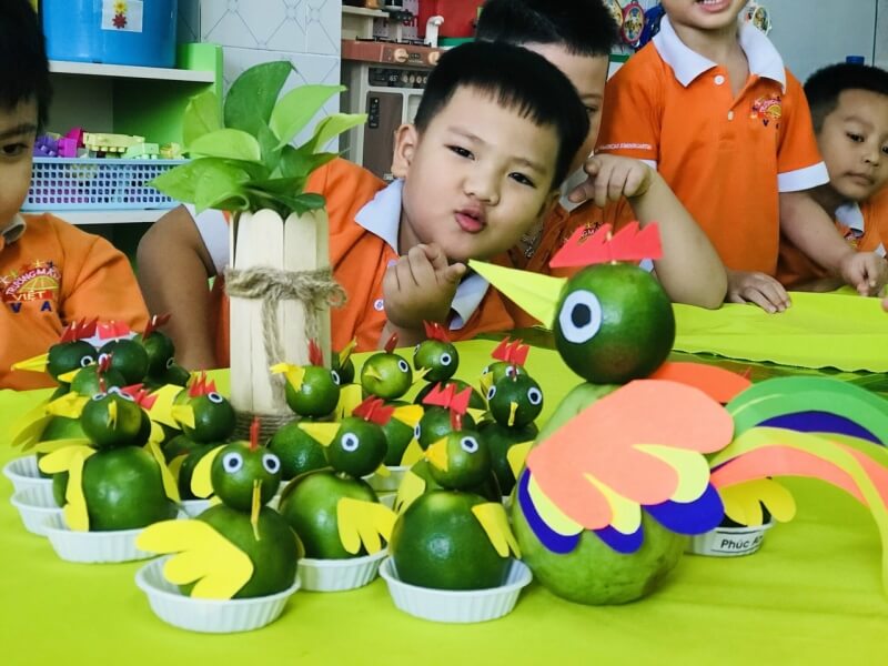 Trẻ được trải nghiệm kỹ năng chọn đúng màu, phân biệt đúng hình tròn to làm thân con gà, hình tròn nhỏ làm đầu con gà.